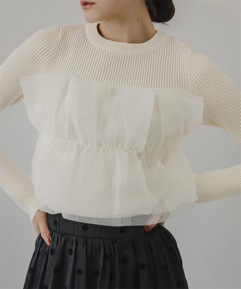 フリルトップスは、シンプルながらも印象的なデザインが魅力です。程よいフリルが女性らしさを引き立て、カジュアルからきれいめまで幅広いスタイルに対応できます。割とタイトなシルエットです♪